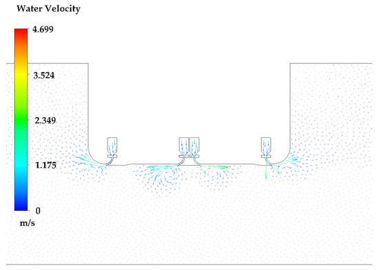 To further compare the liquefaction capacity of different jet velocities, different jet velocities were calculated, and the results are shown in Figure 9. The results showed that the thickness of the water film under the bottom of the submersible tended to decrease in relation as the jet velocity increased. The liquefied soil thickness reached the maximum when the jet velocity was 8 m/s. As the jet velocity increased, the crossflow along the bottom of the submersible became more obvious to reduce the water film thickness. The rotating vector was variable as the jet velocity increased, and when the jet velocity reached an optimum value, the disturbance ability of the jet was the strongest and the liquefied soil thickness was the largest.