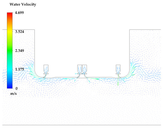 The calculation of a continuous jet was carried out to clarify the law of a horizontal jet in liquefied soil. As can be seen from Figure 6, the water jet was an effective method for liquefying soil, and soil liquefaction is distributed in layers. The flow channel was first connected near the submersible’s bottom; then, hydrostatic pressure was restored fully because of the wall boundary effect. Water jets that were near the submersible’s side diffused upward along the wall, and other ones located in the center diffused horizontally. Combined with Figure 7 and Figure 8, it can be seen that during the continuous development of the water jet, some of the jet provided a rotating vector which could disturb the sediment, causing liquefaction. Because of the concentration of the jet energy, most of the jet vector still had a steady velocity potential and developed along the submersible’s bottom. This part of the energy promoted the forward development of the jet, and then the water jet would enter into open waters by breaking through the submersible’s bottom constraint. The hydrostatic pressure under the submersible’s bottom would be restored eventually.