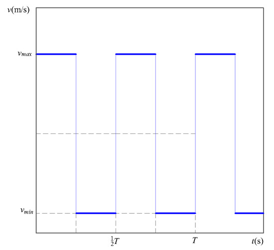 According to the above analysis, it was found that the continuous jet could liquefy soil, but its disturbance capacity was limited. In order to increase the disturbance ability of the jet and improve the liquefaction efficiency, the pulsed jet calculation was carried out on the basis of the original two-dimensional calculation model. Through analysis, it is concluded that the sinusoidal pulsed jet and the rectangular pulsed jet can not only show the stability in a short time, which was beneficial in forming water film under the submersible’s bottom, but also had a certain pulse energy, which improved the disturbance ability. Therefore, the two types of jets were analyzed, and the jet types are shown in Figure 10 and Figure 11.