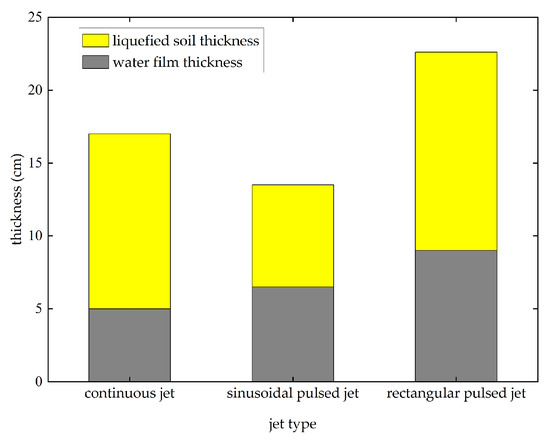 - The water film thickness was 6.5 cm, and the liquefied soil thickness was 7 cm, which was based on the sinusoidal pulsed jet.