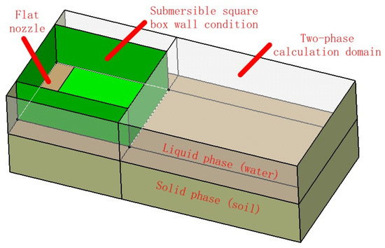 In order to guide experimental research design, a three-dimensional soil liquefaction calculation by a water jet was carried out by establishing a model including a rectangular body, a flat jet nozzle and a two-phase calculation domain, as shown in Figure 15. In order to improve the accuracy of the solid–liquid two-phase flow calculation, the mesh was encrypted at the phase interface.