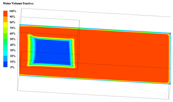 To obtain the evolution of the horizontal line jet under the submersible’s bottom in a three-dimensional computational domain, the calculation was carried out by using a continuous jet with 60 cm/s. The liquefaction state of the soil under the submersible box’s bottom was obtained by calculation, as shown in Figure 16, Figure 17, Figure 18 and Figure 19. The results showed that the water jet developed to two sides of the submersible box and then gradually converged to the center because of the minimum energy principle. Therefore, the process of soil liquefaction was not parallel to the direction of the jet but gradually converged to the middle. In order to represent the evolution of the jet accurately, the development of the line jet was drawn in Figure 20. This figure showed that the water jet that was under the bottom of the submersible box developed to the transition section, which was consistent with the liquefaction pattern shown in Figure 16, Figure 17, Figure 18 and Figure 19. The line jet liquefied all soil under the submersible box’s bottom and finally formed a complete flow channel with jet development, as shown in Figure 21. Adequately, soil liquefaction is an important means of restoring the hydrostatic pressure on the bottom of a submersible box, which is from Figure 1. As shown in Figure 19, the soil under the submersible box’s bottom can be completely liquefied through a horizontal line jet flow. In summary, it was considered that the horizontal line jet could liquefy soil, and the buoyancy of the submersible box was recovered.
