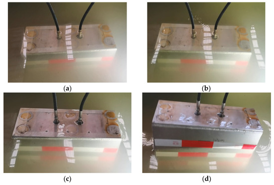As shown in Figure 25, a submersible box was adsorbed into the sediment at the initial state (t = 0 s). The water jet was started, and some of the bubbles appeared after 6 s. As the water jet continued to gather energy, it eroded the soil under the bottom of the submersible box and formed a liquefaction layer. The box started to float up at last because of the reserve buoyancy. It was found that the buoyancy of the submersible box was restored by applying a horizontal line jet to the bottom. The result showed that the water jet could liquefy sediment to eliminate the bottom sitting adsorption effect.