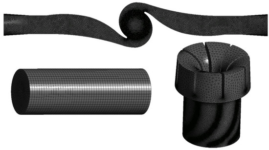 The whole computational domain is composed of the inlet pipe, the impeller, and the twin volute. All the parts except for the inlet pipe were generated with an unstructured mesh using ANSYS Meshing software, and Figure 4 depicts these grids in more detail.