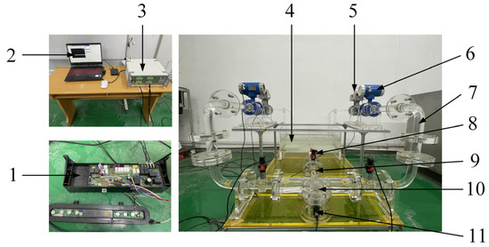 Figure 5 depicts the hydraulic performance test bench for the new type of dishwasher pump. It included a tank, a pump, an outlet pipeline, and an intake pipeline. The instrument location and the pipes leading from the outlet to the water tank were symmetrically placed, and the diameter of the volute outlet was 40 mm. Intelligent pressure sensors with an accuracy of 0.2% FS were used to measure the inlet and outlet pressure of the dishwasher pump, and the measuring range of pressure sensors was −20 kPa~20 kPa at the inlet and 0 kPa~30 kPa at the outlet.