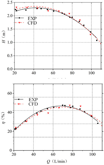 where H is the head of the pump (m); Pout and Pin are the total pressure of the pump outlet and inlet, respectively (Pa); ρ represents the water density (kg/m3); and g is the gravitational acceleration (N/kg).