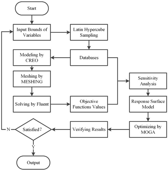 As shown in Figure 7, an automatic optimization process was implemented for improvement in the efficiency of a new type of dishwasher pump by using Creo and ANSYS Workbench software. First, the complex twin-volute structure in the real machine was simplified, and the simplified twin-volute profile was controlled by six radii of curvature; the magnitude of these six radii of curvature was set as design variables. Second, within the boundaries of the design parameters, 100 twin-volute designs were generated using the Latin hypercube sampling (LHS) method and distributed at random throughout the designed space. Third, the simulation of these 100 cases was performed using ANSYS Fluent. Finally, optimization was based on sensitivity analysis and response surface optimization, which employed the MOGA method to iterate the twin-volute solution in search of the local optimal solution.