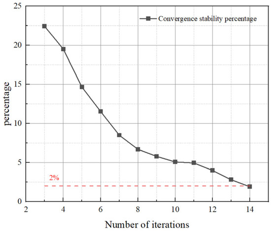 According to the Equation (6), only the individuals located on the Pareto frontier can make the assessed value equal to one, and this figure will be smaller if the individuals go farther. As depicted in Figure 8, when the number of iterations reached 5, the percentage of convergence stability was less than 2%, and the calculation stopped.