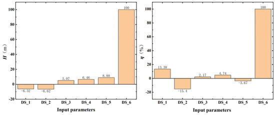 The local sensitivity of the six input parameters of the twin-volute design relative to its two output parameters (head and efficiency) is given in Figure 9. As can be seen, the change in the input parameter “DS_6” was the most sensitive to the head and efficiency of the dishwasher pump, which means that even a small change in the input parameter “DS_6” would result in a significant change in the output parameter, whereas the change in the input parameter “DS_3” was the least sensitive.