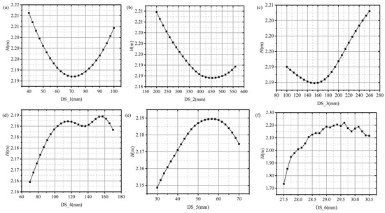 Effect of design variables on the head: (a) DS_1, (b) DS_2, (c) DS_3, (d) DS_4, (e) DS_5, and (f) DS_6.