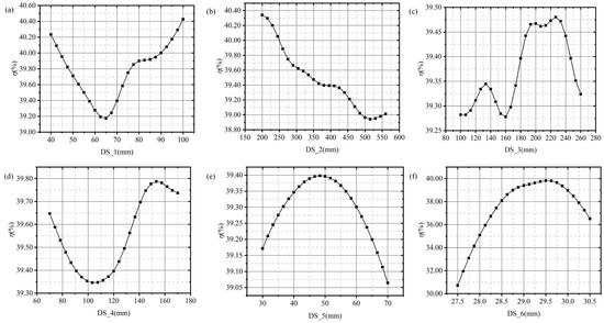 Effect of design variables on efficiency: (a) DS_1, (b) DS_2, (c) DS_3, (d) DS_4, (e) DS_5, and (f) DS_6.