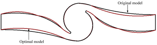 As shown in Table 6, three optimal samples were found by using MOGA. All three examples had higher heads than the original heads. As a result, the most effective candidate was chosen as the best choice. In this scheme, the twin-volute dishwasher pump had a head of 2.2099 m and an efficiency of 42.13%. The two-dimensional comparison diagram of the twin-volute profile is given in Figure 12 and is based on the values of each parameter of the twin-volute profile before and after optimization.