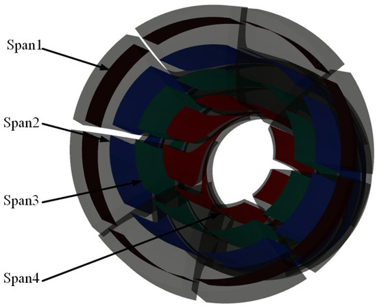 As shown in Figure 14, the channels of the impeller, four toroidal surfaces were selected in the blade radial direction based on the central axis of the impeller, which passed through the bottom and top of the impeller, and the axial surface of each torus was expanded to facilitate a more intuitive observation of the distribution of turbulent kinetic energy.