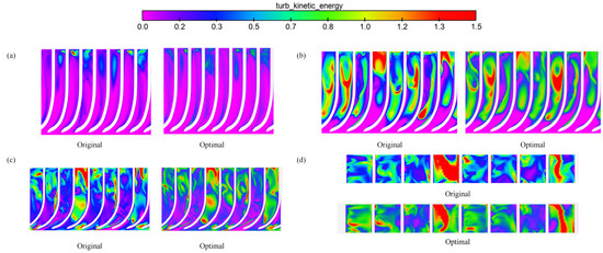 The turbulent kinetic energy distribution on the four toroidal surfaces in the impeller of the twin-volute pump before and after optimization are compared in Figure 16. Figure 16a demonstrates that, in both the original and optimal models, the turbulent kinetic energy in the Span1 plane of the dishwasher pump impeller was primarily distributed at the outlet of the impeller, demonstrating that turbulent vortices were more intense during the flow transition from the impeller to the volute. From Figure 16b, it can be inferred that, when the impeller flow channel was close to the two-volute tongues, the turbulent kinetic energy in the fourth and eighth channels of the impeller gradually increases from the inlet to the outlet of the impeller, while the turbulent kinetic energy in the other channels of the impeller that were not located at the volute tongue was primarily concentrated in the middle part of the impeller. It can be seen from Figure 16c that the water flow in the impeller channels fully developed and became more complex as the annular surface of the impeller moved away from the hub of the impeller, and the turbulent kinetic energy gradually filled the entire impeller channels. As a result, a relatively high turbulent kinetic energy distribution also appeared in the area of the leading edge of the blade inlet. Figure 16d demonstrates that, while the turbulent kinetic energy of the optimal model was significantly higher than that of the original model in some impeller channels, such as channels 4 and 8, it was significantly lower in those positions close to the volute tongue. Nevertheless, the optimal model was more effective in lowering the gradient of the impeller channels. As a result, the turbulent kinetic energy distribution became more uniform. In conclusion, the impeller of the optimal model had a lower overall distribution of the turbulent kinetic energy than the original model, which contributed to a reduction in the hydraulic loss of the impeller and an increase in the overall efficiency of the pump.