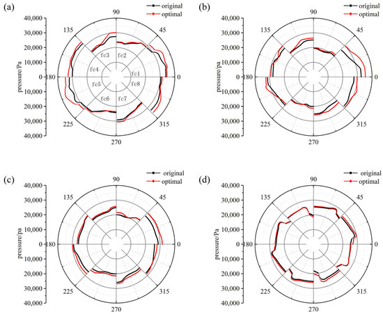 The pressure profile in the flow channels of the model impeller before and after optimization is given in Figure 17. Figure 17a–c shows that, except for channels 1 and 5, which are close to the volute tongue, the pressure on the blade pressure side in the majority of impeller channels was higher than the pressure on the suction surface. Figure 17d, however, reveals the opposite result at the impeller inlet position. In contrast to Figure 17a,d, the pressure distribution in the flow channels was similar in positions close to the impeller inlet and regularly changed. The difference in the pressure distribution between each of the flow channels of the impeller became gradually apparent as it approached the position of the impeller output. The impeller outlet flow pattern became complex as a result of the interference between the volute and impeller, and the flow of uncertainty increased. The pressure in each flow channel of the impeller was higher after optimization, and the closer to the impeller outlet, the greater the pressure difference before and after optimization, as is evident from the pressure distribution in channels 1 and 5. This can be verified by comparing the models before and after optimization.