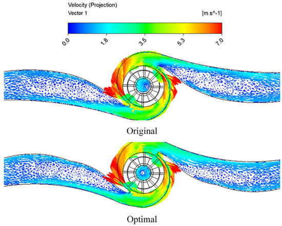 Figure 18 shows the velocity vector comparison diagram on the middle section of the twin-volute pump before and after optimization. Figure 18 demonstrates that the interaction between the impeller and the volute on the flow pattern resulted in a localized high-speed area at the location of the twin-volute tongues. The velocity gradually dropped as water moved downstream of the volute channel, presumably as a result of the expansion of the flow area via the volute.