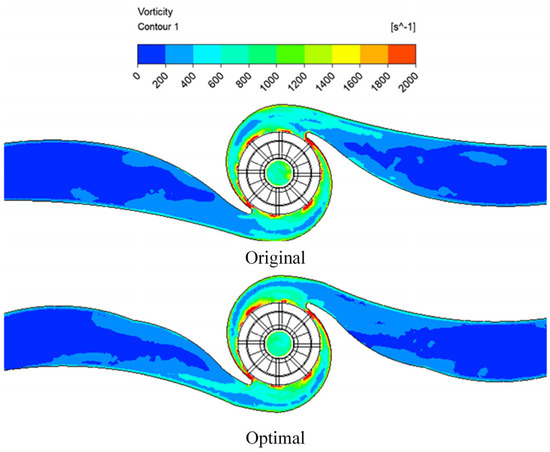 According to Figure 19, the vortices in the twin-volute model were primarily distributed in the outlets of eight blades and two tongues, with a significant number of wall vortices also being produced on the volute wall. The vortices downstream of the volute gradually diminished as the vortices formed and shed themselves. The optimal model efficiently reduced the vorticity in the volute inlet area and decreased the hydraulic loss, demonstrating that it is more efficient than the original model.