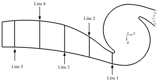 Figure 20 depicts the linear position diagram parallel to the top of the twin-volute structure and running along the outlet direction to examine the pressure changes from the volute tongue position to the outlet after the water passed through the new type of dishwasher pump. The pressure distribution on each line was analyzed as follows: