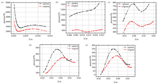 Figure 21a demonstrates how the water flow collided and extruded with the tongue as it passed through the impeller, causing the pressure to rapidly drop in those places closer to the tongue and gradually change with more distance. By comparing Figure 21b,c, it can be seen that the highest pressure was close to the outside wall of the volute, and the minimum pressure was close to the inner wall. The pressure gradient steadily increased as the water flow downstream developed, and this characteristic is also evident at the intersection of Lines 4 and 5. Figure 21d,e shows that the pressure trend is parabolic in general. The pressure was minimal close to the walls on either side of the volute and was greatest in the flow channel in the center of the volute. Overall, the optimal twin-volute structure ensured the enhancement of the pump pressure since the pressure of the optimal model at each point was higher than that of the original model.