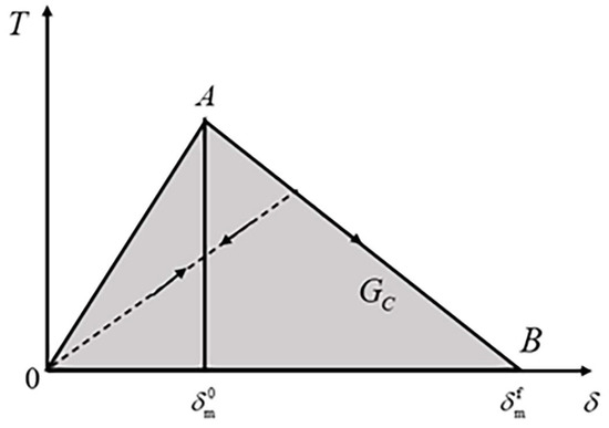 The relationship between the tensile stress and the distance between the upper and lower surfaces is defined in the damage model of the Cohesive unit, and the definition of the damage evolution consists of two parts. A bilinear T-S criterion was proposed by V. Tomar [37]. As shown in Figure 2, the first part involves determining the effective displacement at full damage relative to the effective displacement at the onset of damage, or the energy dissipation due to failure. The second component defines the evolutionary nature of the damage variable D between initial and complete failure, which can be specified directly in the form of a table of effective displacement, effective displacement versus damage, by means of a linear or exponential softening law; the expression for the damage variable when the linear displacement expansion criterion is used is: