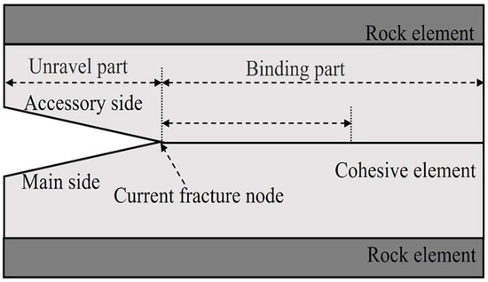 Figure 3 shows a schematic diagram of the crack expansion of the cohesive unit. When the calculated energy release rate at the fracture tip node is greater than the B-K critical energy release rate, the current fracture tip node of the cohesive unit will unbind the bound part, and then the fracture will open and continue to expand along the next cohesive unit.