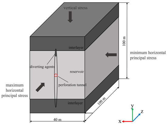 The numerical calculation model established in this paper is shown in Figure 5 for a three-dimensional model with dimensions of 40 m × 100 m × 100 m. The following assumptions are made for the model material: the reservoir is an ideal thick oil layer and the rock is an ideal linear elastic homogeneous material. The model is dissected into four areas, the thickness of both upper and lower layers as barriers is 20 m, the thickness of the middle area as the target reservoir is 60 m, and the height of the artificial barrier area formed by the diverting agents placement is 5 m. The (a) and (b) figures in Figure 6 show the profiles of the xoy plane and yoz plane, respectively. The perforation tunnel is chosen to be the center of the xoy plane, y is the direction of vertical principal stress, z is the direction of maximum horizontal principal stress, and x is the direction of minimum horizontal principal stress. The built-in Cohesive cell is embedded in the yoz plane as the fracture initiation and propagation path, perpendicular to the direction of the minimum horizontal principal stress, and the shot hole position is parallel to the direction of the maximum horizontal principal stress. The fracture propagation path and the basic morphology at different moments (t1, t2, t3) are depicted in Figure 6b. The type of solid element is C3D8P, which is a three-dimensional calculation unit with 8 nodes. It has the advantage of more accurate results for the displacement and the accuracy of the analysis will not be affected too much when there is distortion and deformation of the mesh. The mesh size of the numerical calculation model is chosen to be 2 m, and hexahedral elements are used completely in the mesh. For the three-dimensional geometric model, the mesh is first generated on the face and then stretched along the sweep path to obtain the three-dimensional mesh, and a total of 50,000 meshes are divided. The initial saturation of the target layer and the interlayer is set to 1; both are saturated seepage, and the constant pore pressure (20 MPa) is maintained at the left, right and upper and lower boundaries. The initial pore pressure is 20 MPa, the initial porosity of the reservoir is 0.3, and the initial porosity of the interlayer is 0.2. The fracturing fluid pumping discharge is set to 0.06 m3/s for 600 s, the fracturing fluid viscosity is 100 mPa·s, and the other initial values of the main calculated parameters are shown in Table 1.