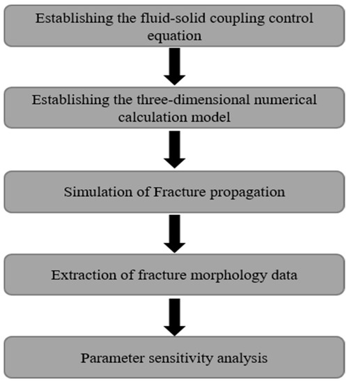 Figure 7 shows the workflow of this study. The first step is to establish the fluid-solid coupling control equation on the basis of computational fluid dynamics. The second step is to establish a three-dimensional numerical calculation model considering artificial barriers in the finite element simulation software. On the basis of this model, combined with the previous laboratory experimental results, the calculation parameters are determined and the numerical simulation of fracture propagation is carried out. After the simulation, 3D fracture morphology data, model stress, and pore pressure clouds are extracted for parameter sensitivity analysis and discussion.