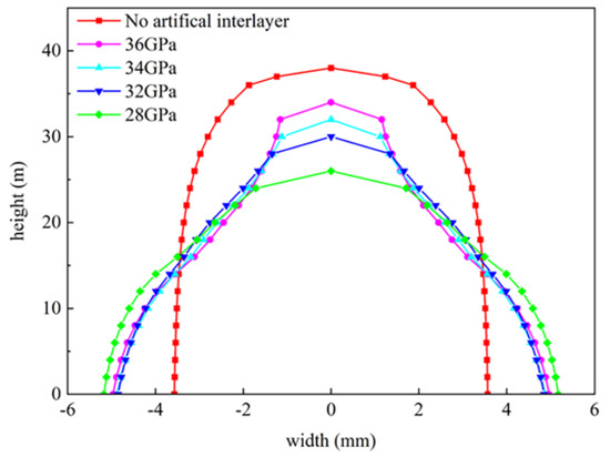 The Young’s modulus of the reservoir rock is 30 GPa, the Young’s modulus of the interlayer is 28 GPa, and the Young’s modulus of the artificial barrier formed by diverting agents is 36, 34, 32 and 28 GPa, respectively. The values of other calculated parameters are shown in Table 2. The effect of different Young’s modulus of the artificial barrier on the fracture morphology is simulated and studied. Figure 8 shows the graphs of the fracture width and half-slit height under different Young’s modulus. It can be seen from Figure 8 that the larger the Young’s modulus of the artificial barrier, the more easily the fracture extends in the direction of the fracture height. Additionally, the change in the direction of the fracture width is not obvious and the range of the fracture width is distributed from 4.7 to 5.2 mm. However, there is a significant increase in the fracture width compared to the case without artificial barrier. It is analyzed that this is because the Young’s modulus will make the width of the fracture narrower, and the fracture height will increase correspondingly for a certain volume of injected fluid and leak-off. On the other hand, the higher the Young’s modulus of the artificial barrier, the more likely it is to develop high stresses at the fracture tip, and the more likely it is for the fracture to expand forward under the same tensile strength conditions.