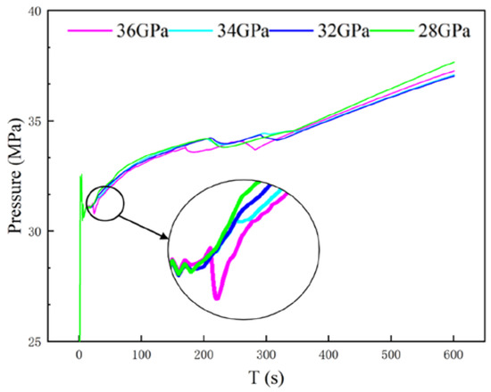 It is noteworthy that the fracture breaks through the area of each artificial barrier to extend into the area of the interlayer under the condition of Young’s modulus of the artificial barrier of 34 GPa or 36 GPa. Figure 8 shows that when the fracture penetrates the intersection and extends in the artificial barrier with a smaller Young’s modulus (28 GPa), the fracture width will increase slightly due to the sudden increase in the amount of leak−off when the fracture penetrates the dividing line between the artificial barrier and the interlayer, which leads to a slight increase in the fracture width and also an increase in the fracture height. Figure 9 shows the variation curve of pore pressure at the injection point with the injection time during the fracturing process, and the pore pressure variation when the fracture expands to the artificial barrier area is labeled. From Figure 9, it can be seen that the pore pressure at the injection point decreases slightly with the increase in Young’s modulus of the artificial barrier; the higher the pore pressure at the injection point, the greater the impediment to fracture extension. This indicates that the small Young’s modulus of the artificial barrier does have a hindering inhibiting effect on the vertical propagation of the fracture.