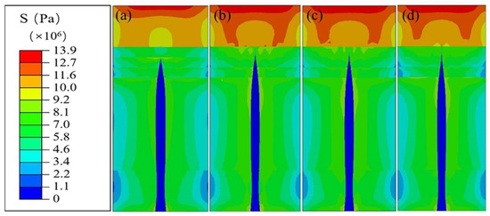 Stress distribution cloud after fracturing under different Young’s modulus conditions: (a) 28 GPa, (b) 32 GPa, (c) 34 GPa, (d) 36 GPa.