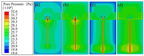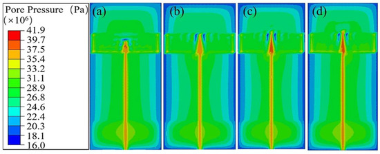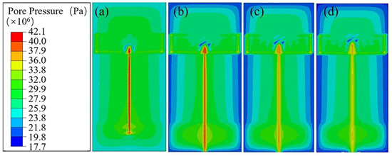 Pore pressure distribution cloud after fracturing under different Young’s modulus conditions: (a) 28 GPa, (b) 32 GPa, (c) 34 GPa, (d) 36 GPa.