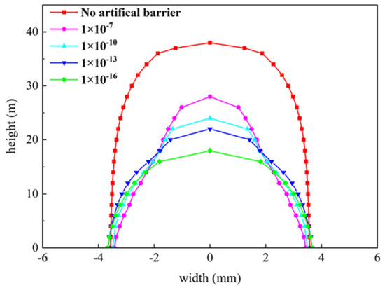 The size of the formation permeability is an important factor affecting fracture expansion, with low permeability reservoirs prone to fractures of a smaller horizontal extent and larger width, and the opposite for high permeability reservoirs [43]. The values of other calculated parameters are shown in Table 3. Since the fracture is extended on the preplaced cohesive cell, the fluid normal leak-off coefficient for the cohesive cell pore material defines the pressure-flux relationship between the intermediate nodes of the bonded cell and their adjacent surface nodes, and thus this coefficient can be interpreted as the cohesive bonded cell surface permeability of a finite material layer. Changing the leak-off coefficient of artificial barrier (1 × 10−7, 1 × 10−10, 1 × 10−13, 1 × 10−16) and studying the effect of the change in permeability of the artificial barrier on the fracture height, Figure 12 shows the graphs of the fracture width and half-slit height under different leak-off coefficients. With the decrease in the permeability of the artificial barrier, the morphology of the fracture changes greatly, and the change in fracture width direction is not significant. However, the control of permeability on the direction of fracture height of the fractured fracture is more obvious, in which the change in fracture height under the condition of maximum and minimum leak-off coefficient reaches about 10 m. When the leak-off coefficient of the artificial barrier is 1 × 10−16, the half fracture height is 16 m, when the leak-off coefficient increases to 1 × 10−7, the half fracture height increases by 10 m, but the width of the fracture decreases by about 0.2 m. This shows that the artificial barrier with low leak-off coefficient has significant control on the fracture height. Therefore, the placement of the artificial barrier with good sealing properties and a low leak-off coefficient is an important technical means to effectively control the fracture height.