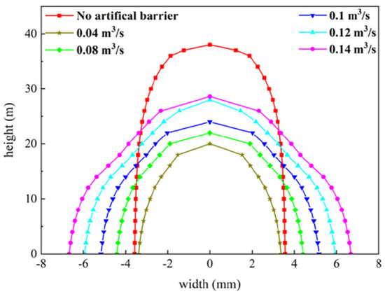 In this section, the effect of different pumping rates on the fracture height extension in the presence of artificial barrier conditions is investigated. Since the model is plane strain, the pumping rates in this model are discounted accordingly to the field discharge, and five gradients are set: 0.04, 0.08, 0.1, 0.12, and 0.14 m3/s. Other parameters of the stratum are shown in Table 4, and the fracture morphology calculated by a numerical simulation is shown in Figure 14. With the increase in pumping rate, the fracture width and fracture height increase, and when the displacement increases from 0.12 m3/s to 0.14 m3/s, the extension in the fracture height direction is not obvious, and the fracture width continues to increase. The reason is that at this time, the factors affecting the fracture height are not only the size of pumping volume, but also the Young’s modulus and permeability of the artificial barrier.