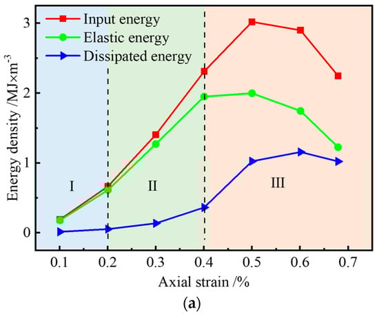 In order to compare the proportional distribution of elastic energy density and dissipated energy density in different stages, two dimensionless parameters, elastic energy ratio Re and dissipated energy ratio Rd, were introduced in this study, which are the ratio of elastic energy density and dissipated energy density to input energy density, respectively (Equation (3)).