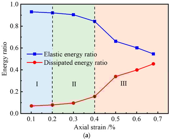 The evolution of the elastic energy ratio and the dissipated energy ratio with axial strain under different gas pressures are shown in Figure 10. The evolution process of energy ratio is roughly divided into three stages: the compaction and linear elastic stage, the yield stage, and the post-peak stage.