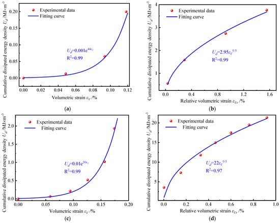 Through the above analysis of energy density, it can be observed that the dissipated energy density of each cycle reflected an increment in damage in this part of the cycle. Furthermore, the damage degree of coal in the ending of every cycle could be expressed by the cumulative dissipated energy density of the previous cycles. At the same time, the volumetric strain, as a characterization of the evolution of pores and fractures in coal, was the internal cause of the damage evolution in the coal. Therefore, in order to study the evolution of cumulative dissipated energy with volumetric strain, the experimental data were expressed with appropriate functions used for fitting analysis.