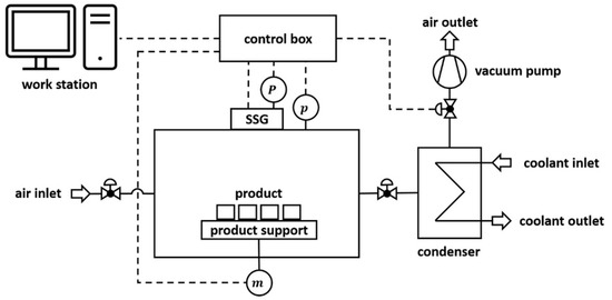 Figure 2 depicts the schematic setup of the laboratory-scale MFD system. The process chamber with dimensions of 612 mm × 400 mm × 300 mm is manufactured from stainless steel. A P 65 D vacuum pump (SASKIA, Ilmenau, Germany) is connected to the process chamber. Between the vacuum pump and the process chamber is a cold trap (UCCT, Vienna, Austria) set to a temperature of −60 °C. A WR340 waveguide is centrally embedded in the top of the process chamber. An HY2020 SSG (TRUMPF, Freiburg, Germany) is connected to the waveguide at the cavity via a coaxial cable. The generator has a maximum output power of 500 W and can be tuned in the frequency range of 2.4 GHz to 2.5 GHz with an accuracy of 0.01 MHz. In addition to the reflected and forward microwave power as well as the respective frequencies, the weight of the product and the pressure in the process chamber are recorded online via Matlab R2020b (MathWorks, Natick, MA, USA). The sensors used are a CMR363 capacitive pressure sensor (Pfeiffer, Aßlar, Germany), a PW4MC3/2kg load cell (Hottinger Brüel & Kjaer, Darmstadt, Germany), and the internal sensors of the HY2020 SSG. The pressure in the process chamber as well as the frequency and power of the microwave field can be adjusted via the self-made process control system. In the present work, the pressure in the system was set to 0.5 mbar.