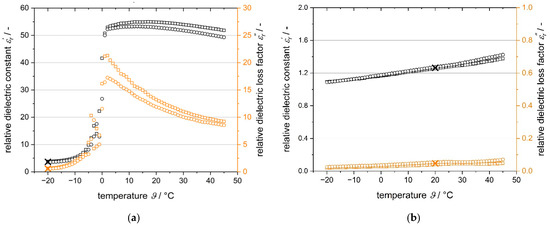 The dielectric properties of fresh tylose gel, shown in Figure 4a, vary considerably in the temperature range studied. This temperature-dependent behavior of dielectric properties and of fresh tylose gel is in line with the literature [35]. The largest increase is detected in the range of −10 °C to 2 °C. This phenomenon can be explained by the melting of frozen water. As the dielectric properties of water at microwave frequencies [42] are much higher than those of ice [43], partial melting of frozen water from approximately −5 °C leads to a significant increase in dielectric properties. The slight increase at lower temperatures, namely −20 °C to −5 °C, is probably caused by an increasing fraction of liquid water in the tylose gel with increasing product temperature, as elucidated in previous studies based on differential scanning calorimetry of tylose gel [44]. The higher value of the tylose gel in the present study containing ascorbic acid compared to published data on tylose gel [35] is presumably due to the compositional differences in the tested material. It has been demonstrated that the addition of compounds to tylose gel can lead to changes in dielectric properties, e.g., for sodium chloride [35,45] and sucrose [45]. At about −5 °C to 0 °C, inconsistencies in dielectric property measurement are attributed to measurement errors caused by partial melting of frozen water in this temperature range. The measurement procedure is not feasible for this temperature range of phase transition. Since the dielectric properties at the aforementioned temperatures are not relevant for the remainder of the present work, a detailed discussion is omitted.