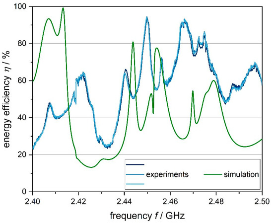 Figure 6 depicts the energy efficiency in dependence on the frequency in the range of 2.4 GHz to 2.5 GHz. The data were obtained from an experimental frequency sweep using the SSG and the post-processing of the electromagnetic simulation of the drying state 0%. The simulative results show clearly defined peaks at resonant frequencies, while the results from the experiments at the beginning of drying show both clearly defined peaks and broader peaks with fluctuations in energy efficiency. Presumably, these fluctuations are caused by several resonant frequencies that are closely spaced. Except for the general existence of maxima and minima in a comparable magnitude, no detailed agreement can be observed between the energy efficiency from the simulation and the experimental frequency sweeps. The experimental data, on the other hand, are well reproducible.