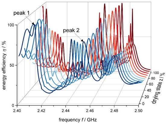 The energy efficiency of the peaks in Figure 8 shifts upwards for peak 2 and downwards for peak 1 with an increasing drying state. The occurrence of spatial maxima of the electromagnetic field at locations with lossy dielectrics determines the energy efficiency of the peaks. Since the pattern of the electromagnetic field is not known in advance, no predictions can be made about the energy efficiency of different frequencies throughout drying.