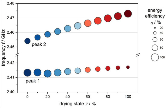 To investigate the frequency shifts of the peaks further, the frequencies of the representative energy-efficient peaks 1 and 2 over the drying state are depicted in Figure 8. The peaks were chosen since one or the other has the highest energy efficiency during all drying states, making them easy to spot and relevant for the control concepts 1RF and 6RF. The shift to higher frequencies during the drying progress is more pronounced for peak 2 than for peak 1. Therefore, the curve of energy efficiency over frequency is a result of the overlapping of multiple resonant modes in different compositions throughout drying. The cause is presumably the superposition of multiple modes displaying different magnitudes in frequency shift with an increase in the drying state. It is not obvious from the appearance of a peak whether only one mode occurs or a superposition of several modes is present. The lower frequency of peak 1 for the drying states 20% and 30% compared to the previous drying state in Figure 8 contradicts the trend of a shift to higher frequencies. The superposition of the peaks of two resonant modes may be the explanation for this observation. A previously separated resonant mode shifts into the mode at peak 1 from a lower frequency. The superposition results in one local maximum, which is shifted to a lower frequency as the resonant mode from a previously lower frequency is still at a frequency slightly below that of the mode associated with peak 1 in preceding drying states.