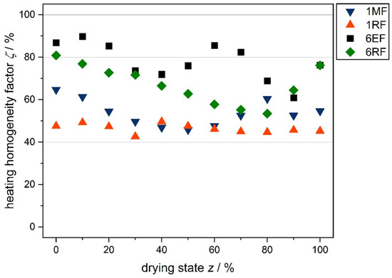 Figure 10 displays the heating homogeneity factor over the drying state for the different control concepts, which enables the evaluation of the homogeneity between the samples. When using multiple frequencies in 6EF and 6RF, there is a higher homogeneity factor compared to single frequencies at almost all drying states. This trend is consistent with more homogeneous microwave-assisted heating in electromagnetic models for the application of multiple frequencies [29,50]. The highest homogeneity with 6EF is presumably due to less dominant individual heating patterns. On the other hand, a few highly energy-efficient heating patterns with similar heating patterns might lower the homogeneity with 6RF.