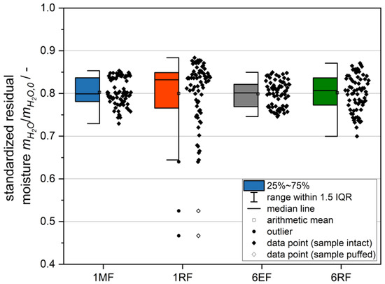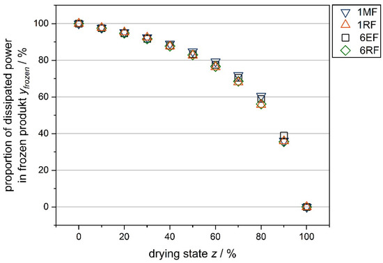 The partly high ranges of residual moisture and outliers, as can be seen with 1RF, are caused by the rapid drying of individual samples. Presumably, this occurs in samples with the highest power input. In extreme cases, high power absorption leads to the melting of the frozen product area and subsequent product damage due to puffing. Visible puffing occurred in two drying experiments applying 1RF in one sample each. The puffed samples can be seen in Figure 13 as outliers with a residual moisture < 0.6. These low residual moisture contents are probably caused by the high power input into the molten samples in combination with the reduced mass transfer resistance due to the large pores formed. The product damage due to puffing can be avoided by applying multiple resonant frequencies with 6RF, even though a higher effective power is coupled in. This underlines the advantage of more homogeneous power input by applying multiple frequencies in MFD.