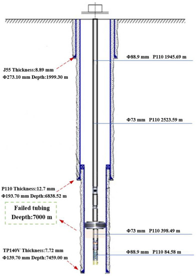 The depth of the failed well that is located in the northwestern oilfield is 7500 m, and the well is rich in CO2 and H2S gas. Among them, the content of H2S is 9318 mg/m3, the partial pressure of CO2 is 1.73 MPa; the temperature of bottom well is 160 °C and the water content is 0.1%. According to the thickness measurement and calculation results, the reduction in wall thickness of tubing above the packer is only 0.125 mm per year, while that of tubing below the packer is as high as 0.445 mm per year. Since the outer wall of the tubing above the packer is exposed to the annulus protection fluid, the outer wall of the tubing is hardly corroded. Moreover, a trace of produced fluid is also found at the bottom of the wellbore. According to the location of the thinned tubing and well depth, it can be judged that the tubing under the packer is in water, leading to serious corrosion. Dong et al. pointed out that condensate, ponding in formation water, and water carried in produced gas are all types of produced water. Therefore, according to the corrosion characteristics of the well, it can be judged that the tubing above the packer is gas-carrying corrosion, while the tubing below the packer is ponding corrosion. The wellbore structure in Figure 1 shows surface casing (Φ 273.10 mm), technical casing (Φ 193.70 mm), and oil layer casing (Φ 139.70 mm) from top to bottom. There is a cement sheath between the casings Tubes 88.9 and 73 mm in diameter are used above and below the packer, respectively.