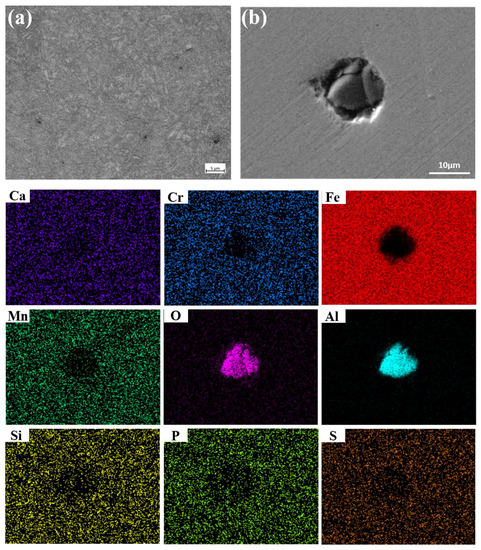According to ASTM E45-18a, GB/T10561-2005 [28], and ASTM E112-13 [29] standard, the samples are machined into 10 mm × 15 mm × thickness to analyze metallographic structure and the non-metallic inclusion and the microstructure, as shown in Figure 2. The microstructure of the failed tubing is tempered sorbite (Figure 2a). The diameter of the inclusion is 12 μm and it becomes an Al2O3 inclusion mainly composed of Al and O (Figure 2b).