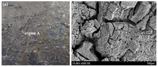 It is observed that the outer wall of the tubing is uniformly corroded and severely scaled, and a layer of black gray scaling products is attached to the outer wall. The adhesive tape is used to stick down corrosion products to observe the morphology due to the fact that the outer films of corrosion product on the outer wall easily fall off, as shown in Figure 6. The scraped corrosion products are extremely loose and many cracks are also observed, which is a channel for corrosion solution.