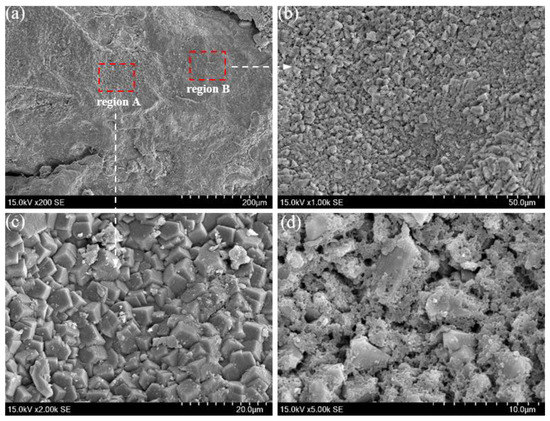 The SEM images in Figure 8 show that the corrosion scales on the outer wall of the tubing include two kinds of morphology (Figure 8a). The first one has some holes on the scales (Figure 8b–d). The second kind of the corrosion scales, which are very dense, are formed by the typical cubic crystal (Figure 8c). The corrosion morphology of the inner and outer wall of tubing is quite different, while the composition of those are similar according to XRD results. Due to the erosion of the corrosion scales on the inner wall by the produced liquid, the corrosion scales become flaky. However, the outer wall of tubing has less fluidity than the inner wall before the packer leakage, and the FeCO3 crystal formed on the outer wall is relatively intact.