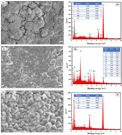 EDS images of corrosion scales on failed tubing. (a,b): Stuck corrosion scales; (c,d): inner wall; (e,f): outer wall.