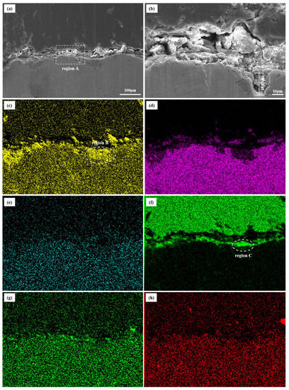 The cross-section morphology and corresponding element distribution images of the inner wall are displayed in Figure 10. The corrosion product films on the inner film are extremely loose and porous. In addition, a corrosion pit with the depth of 19.03 μm is also observed in Figure 10b. According to the element distribution of the corrosion scales, the main elements are O, C, and Fe. A trace of Ba, S, and Sr elements are distributed in the scales (Figure 10c–h). It is remarkable that the C element accumulates in the upper layer, while the O element accumulates in the lower layer (Figure 10c,f).