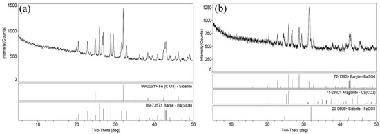 BaSO4 and CaCO3 are the common sulfate scale and carbonate scale in the oilfield (Equations (6) and (7)) [38,39]. The calcium carbonate precipitates and adsorbs on the outer wall of tubing. The most probable reason is that the annulus protection fluid in the annulus is made of the produced water, and traces of Ca2+ ions exist in the produced water. CO2 gas leaks into the annulus, generating CaCO3 precipitation when the packers leak. Barium sulfate is the main component of drilling fluid. Barium sulfate is attached to the inner wall, which may be due to more drilling fluid leaking into the formation during drilling and returning from the produced well during the process of gas production.